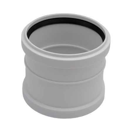 Муфта двухраструбная белая из полипропилена применяется для монтажа безнапорных канализационных систем бесшумной внутренней канализации зданий и сооружений различного назначения.