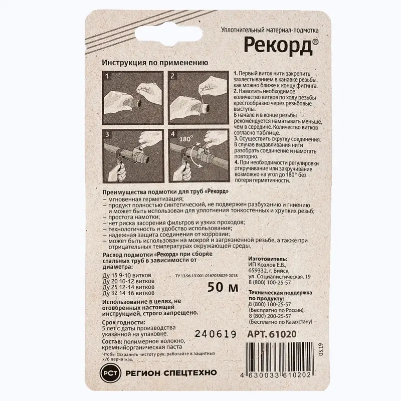 Подмотка Рекорд — это полимерная нить, пропитанная специальным герметизирующим составом — уплотнительный материал последнего поколения, который обеспечивает надежное уплотнение и защищает соединение от коррозии.
