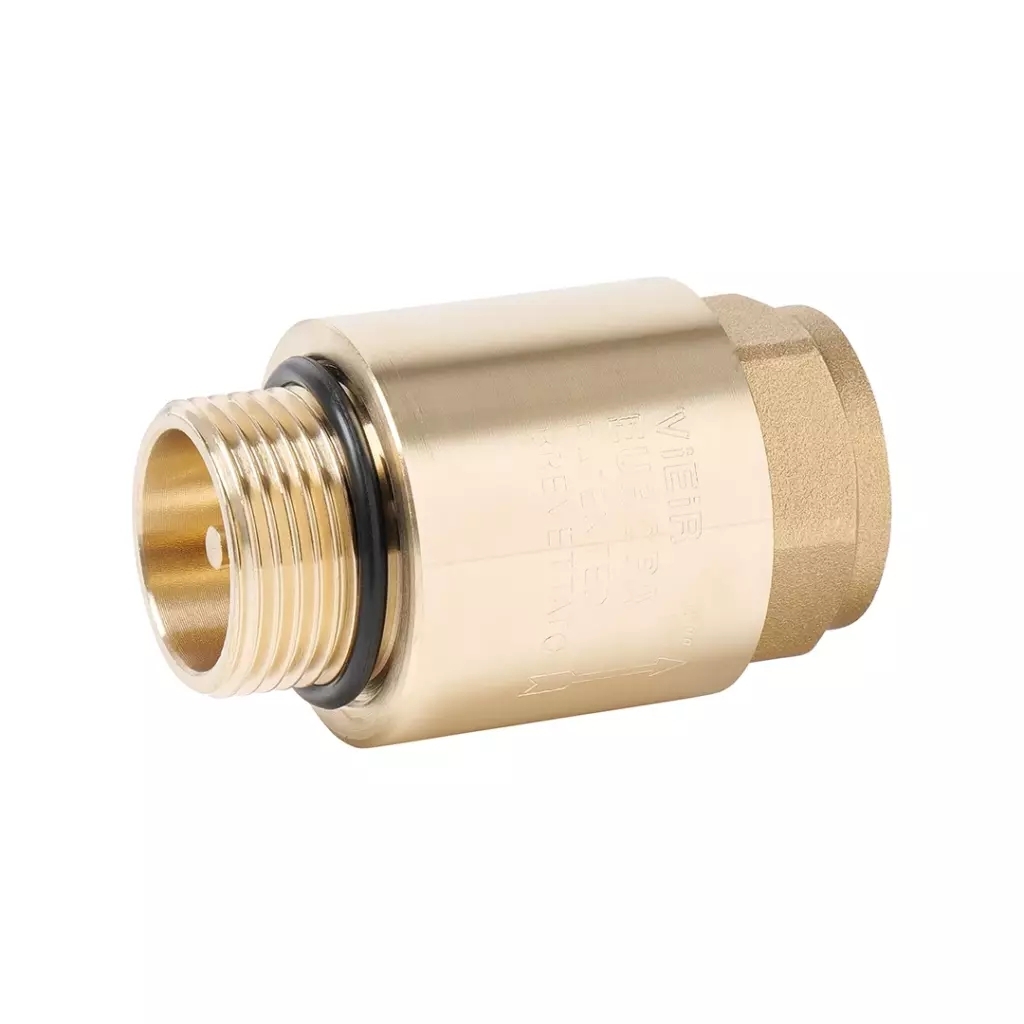 Обратный клапан 1" ВН/ВН резьба — вид защитной трубопроводной арматуры, предназначенный для недопущения изменения направления потока среды в технологической системе. Обратные клапаны пропускают среду в одном направлении и предотвращают её движение в противоположном, действуя при этом автоматически и являясь арматурой прямого действия (наряду с предохранительными клапанами и регуляторами давления прямого действия). С помощью обратной арматуры защищается различное оборудование, трубопроводы, насосы и сосуды под давлением, а также возможно существенно ограничить течь рабочей среды из системы при разрушении её участка.Обратные клапаны VIEIR применяются в системах водоснабжения, отопления, транспортировки газов (например, сжатого воздуха) и жидкостей для пропуска рабочей среды в одном направлении. Клапаны обладают классической пружинной конструкцией, допускают монтаж в любом положении. Корпусы изделий изготовлены из латуни марки .Характеристики Присоединительный размер (мм-дюйм) "1" Материал латунь Тип трубн
