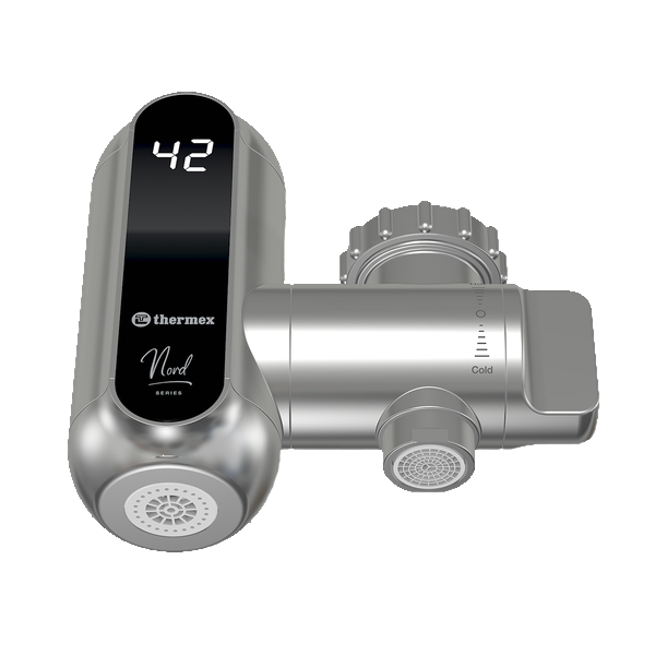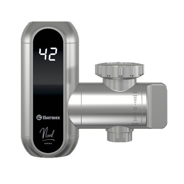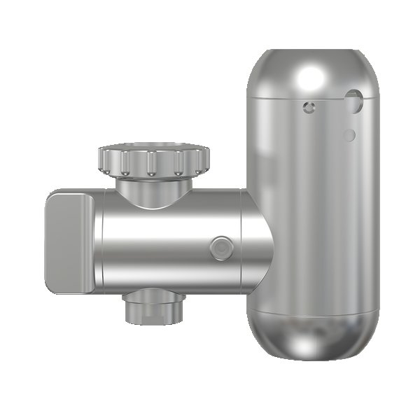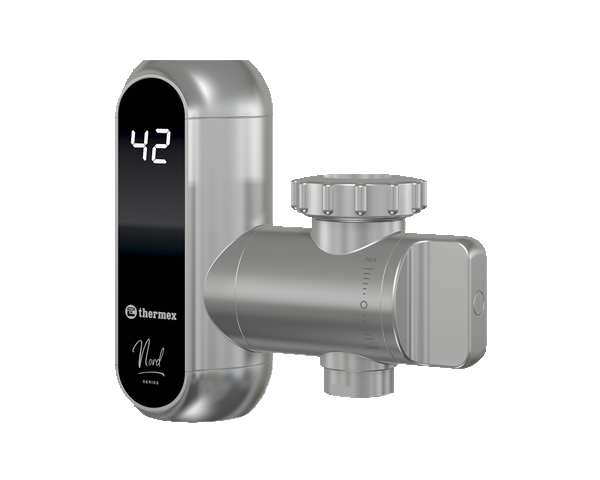 Проточный водонагреватель в оригинальном корпусе для встраивания в кухонную мойку с индикацией нагрева и регулятором производительности.