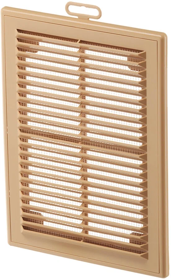 Вентиляционная решетка имеет наклонные жалюзи и оснащена защитной сеткой от насекомых.