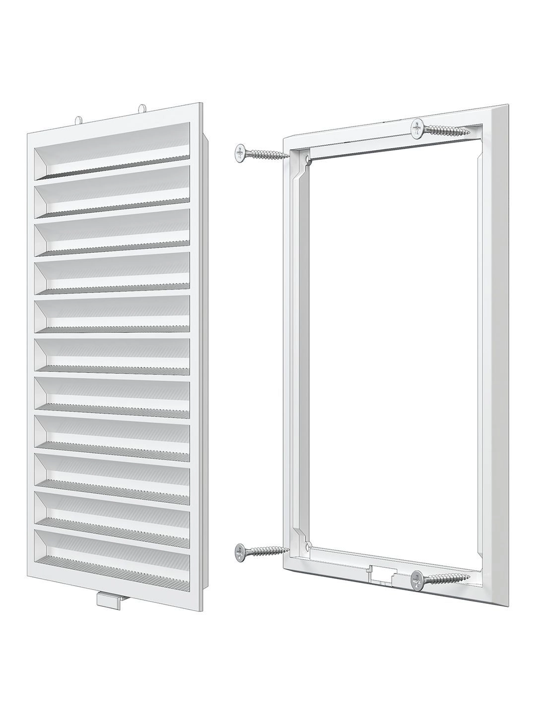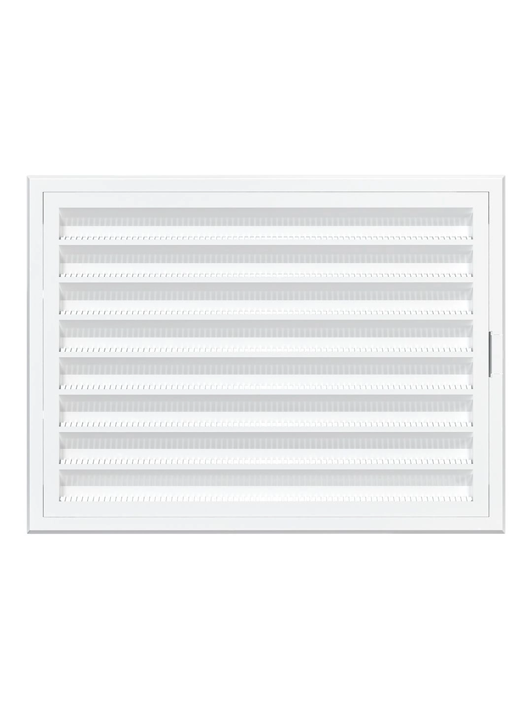 Вентиляционная решетка имеет наклонные жалюзи и оснащена защитной сеткой от насекомых.
