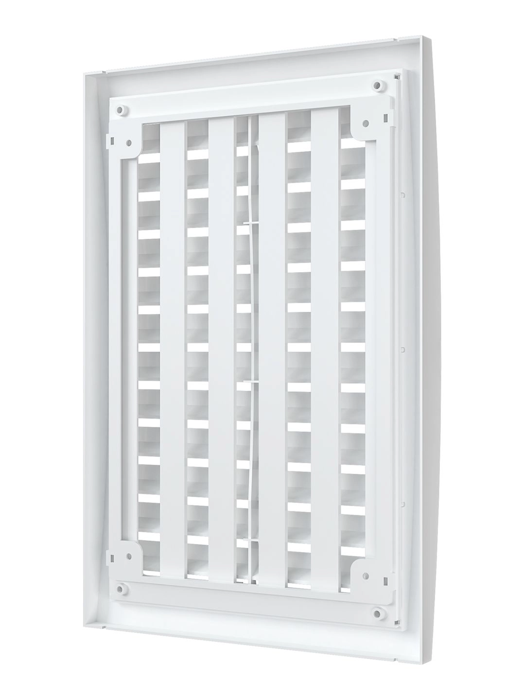 Вентиляционная решетка имеет наклонные жалюзи и оснащена защитной сеткой от насекомых.