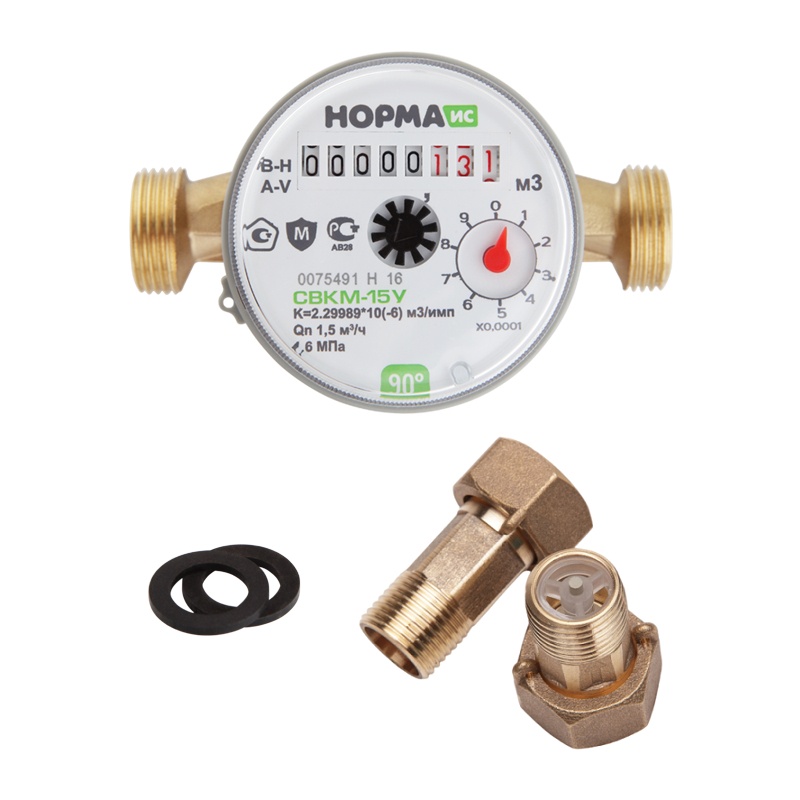 Счетчик воды универсальный НОРМА СВКМ-15 У (холодная ,горячая вода) с латунным комплектом монтажных частей.