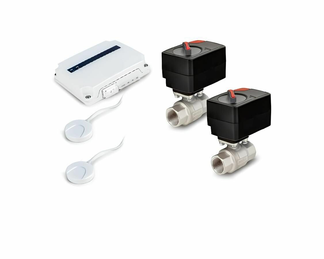 При попадание воды на датчик блок управления выдаст сигнал на шаровые электропривода для отключения подачи воды.