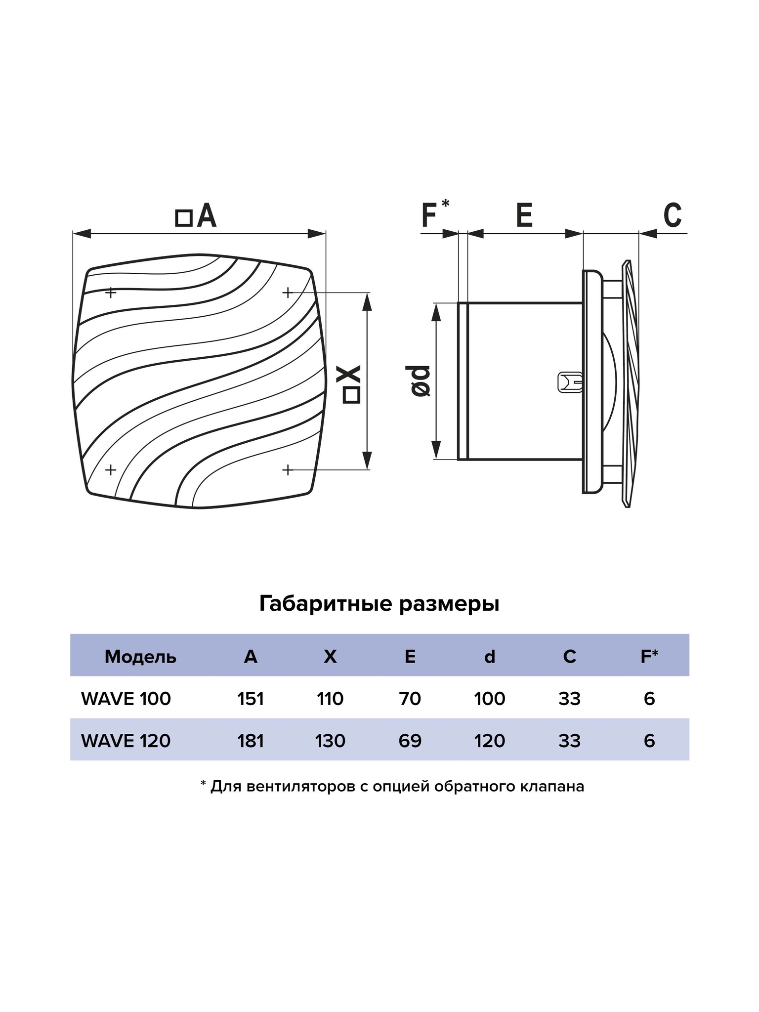 Вытяжной бытовой вентилятор WAVE применяется для постоянной и периодической вентиляции санузлов, ванных комнат, кухонь и других помещений для удаления влаги, и поддержания оптимального микроклимата. Подходит для монтажа в вентиляционные шахты и соединения с воздуховодами.