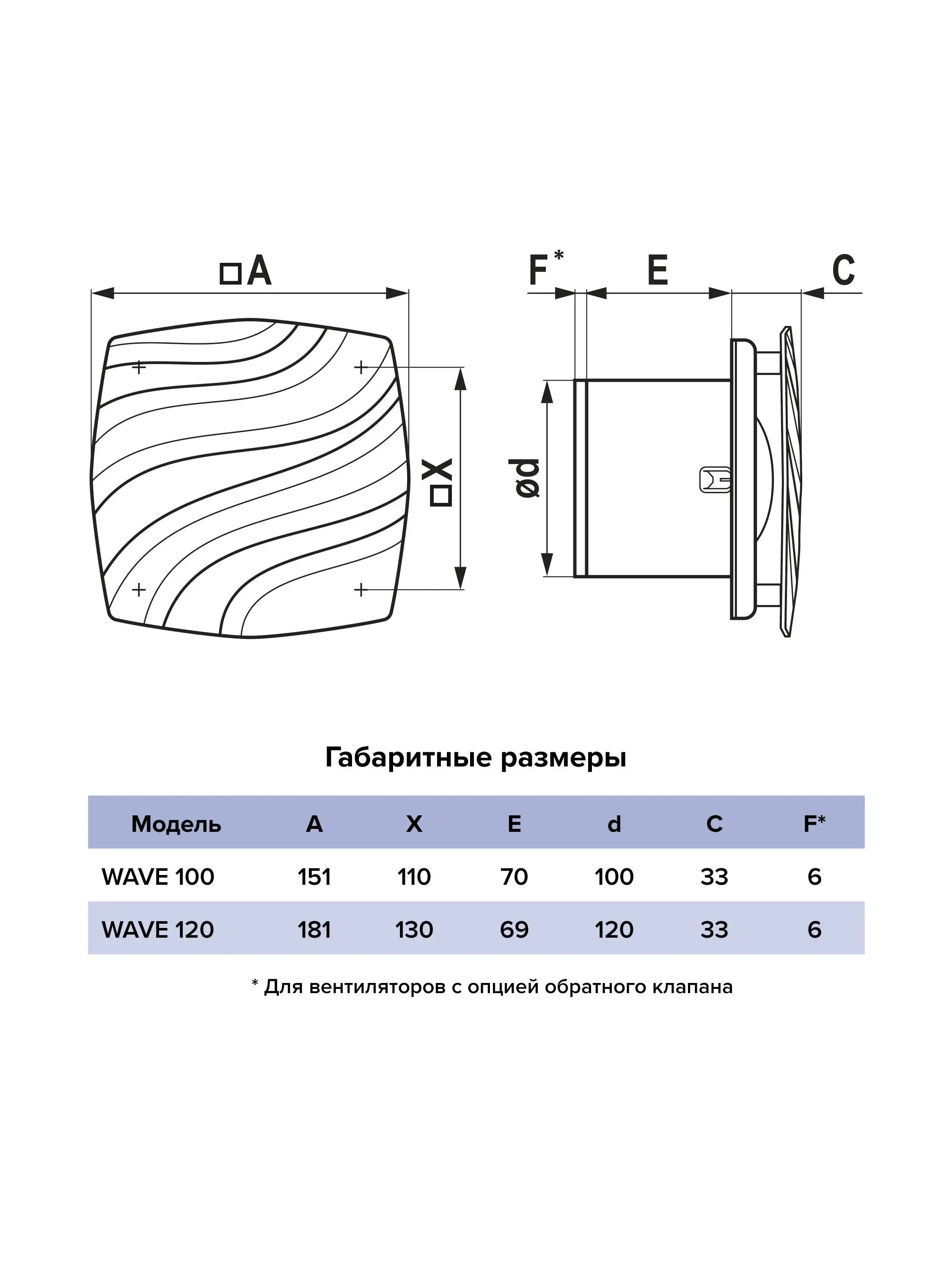 Бытовые вентиляторы WAVE применяется для постоянной и периодической вентиляции санузлов, ванных комнат, кухонь и других помещений для удаления влаги и поддержания оптимального микроклимата. Вентиляторы WAVE оснащены монтажными лапками для простого и надежного крепления; легкосъемной закрытой лицевой панелью. Корпус и крыльчатка выполнены из высококачественного и прочного ABS-пластика, который надежно прослужит весь срок использования. Уровень защиты вентилятора – IP24.